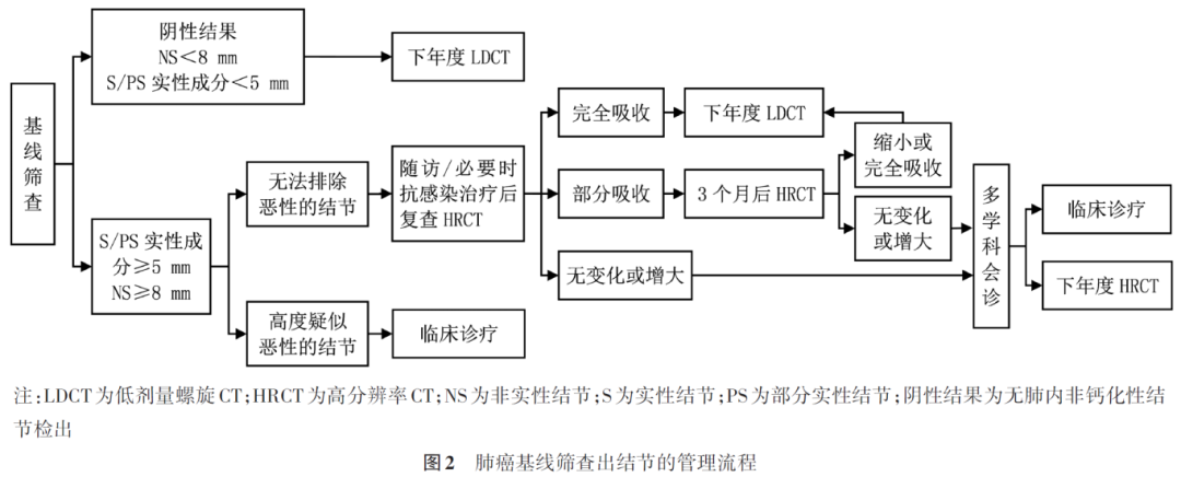 (1)无肺内非钙化性结节检出(阴性结果),或检出的非实性结节平均长径<8 mm,或实性结节/部分实性结节的实性成分平均长径<5 mm,建议进入下年度LDCT筛查。(2)检出的非实性结节平均长径≥8 mm,或实性结节/部分实性结节的实性成分平均长径≥5 mm,如无法排除恶性结节,建议随访或必要时抗感染治疗后复查高分辨率CT(high resolution computed tomography, HRCT);如结节完全吸收,建议进入下年度LDCT筛查;如结节部分吸收,3个月后复查HRCT;如继续吸收或完全吸收,建议进入下年度LDCT筛查;如无变化或增大,建议多学科会诊后决定是否进行临床治疗。对于高度怀疑恶性的结节,建议进行临床治疗。