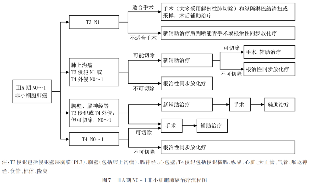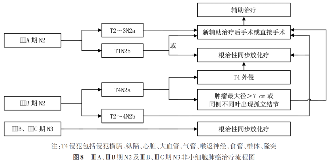 NSCLC新辅助治疗后病理分期采用美国癌症联合会第9版TNM分期系统,T分期中肿瘤大小调整为残存肿瘤的大小,N分期需要根据淋巴结内有无肿瘤细胞归入相应N分期,即国际肺癌研究协会(International Association for Study of Lung Cancer, IASLC)病理委员会专家推荐的yp-TNM分期。