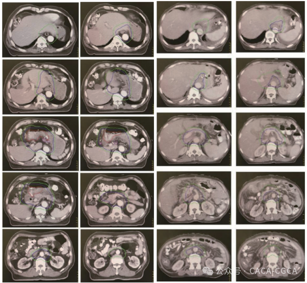 胃癌术前(左)术后(右)放疗靶区勾画示意图
