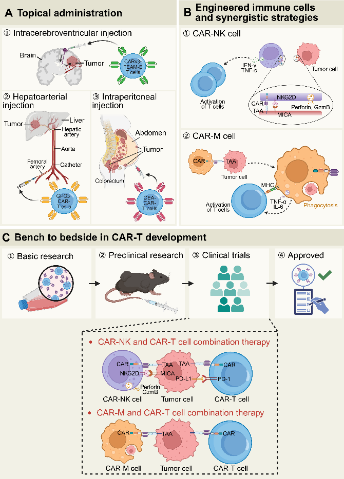 图5. CAR-T局部给药、工程免疫细胞策略和CAR-T治疗的临床转化路线