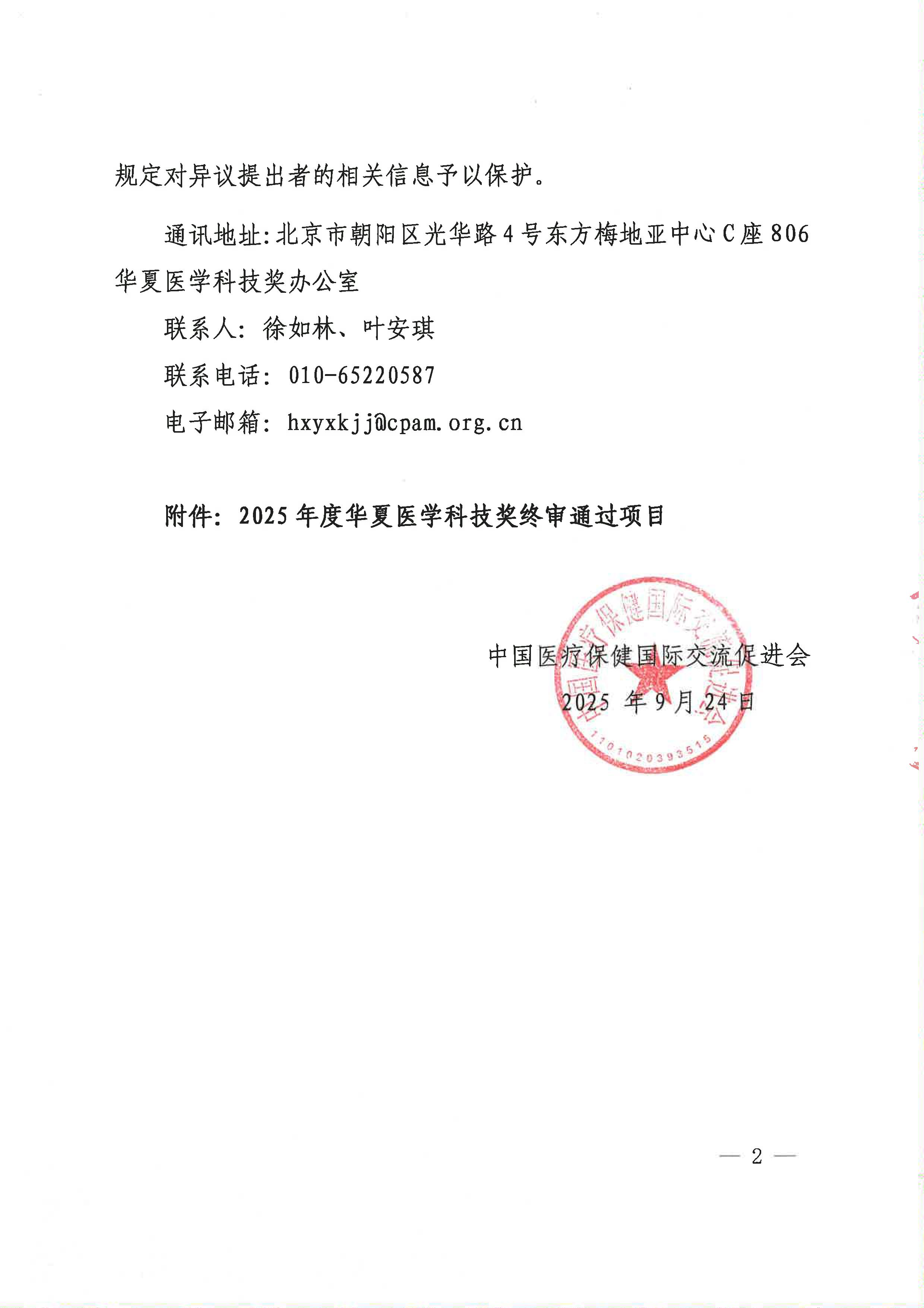 根据《华夏医学科技奖管理规定》,中国医疗保健国际交流促进会(以下简称中国医促会)组织评审专家对2025年度华夏医学科技奖初审通过项目进行了终审。现将终审通过的82项科学技术奖项目,4项卫生事业管理奖项目,1项医学科普奖项目,1名国际合作促进奖候选人,20名青年医学科技奖候选人(详见附件)在中国医促会网站及微信公众号进行公示,公示期14天(2025年9月24日至10月7日)。