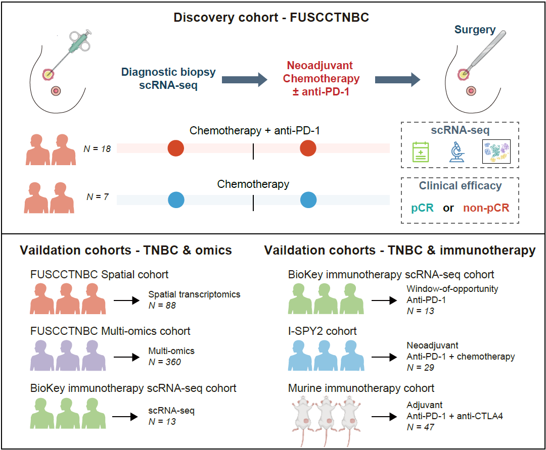 scRNA-seq发现队列:纳入27例早期TNBC患者,其中18例接受新辅助化疗联合抗PD-1治疗,7例仅接受化疗,2例因治疗中断缺乏疗效数据;治疗前采集肿瘤活检样本进行scRNA-seq,用于鉴定疗效相关细胞亚群。